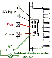 ... es para la conexión del control de cargar. Aquí hay que conectar (si esté disponible) la lámpara de contról. Claro que esto sólo funciona si está disponible una batería. Si la lámpara de contról está conectada (a pesar de todo) sin batería, la lámpara va a dar luz medio oscura mientras el motor está arrancado, aunque esté producido electricidad. En pocas palabras: Sin batería el contacto se queda libre. También cuando no haya una lámpara. |